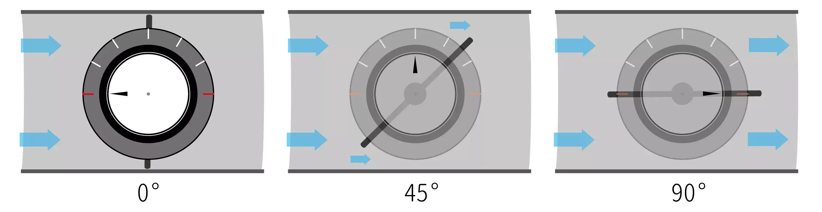 Based on Bernoulli’s law, in the case of fixed atmospheric pressure, the variables are (1) and (3), so v2 (velocity, fluid flow speed) is directly proportional to p (fluid pressure), i.e., the differential pressure is directly proportional to the square of an air velocity (exhaust air volume).