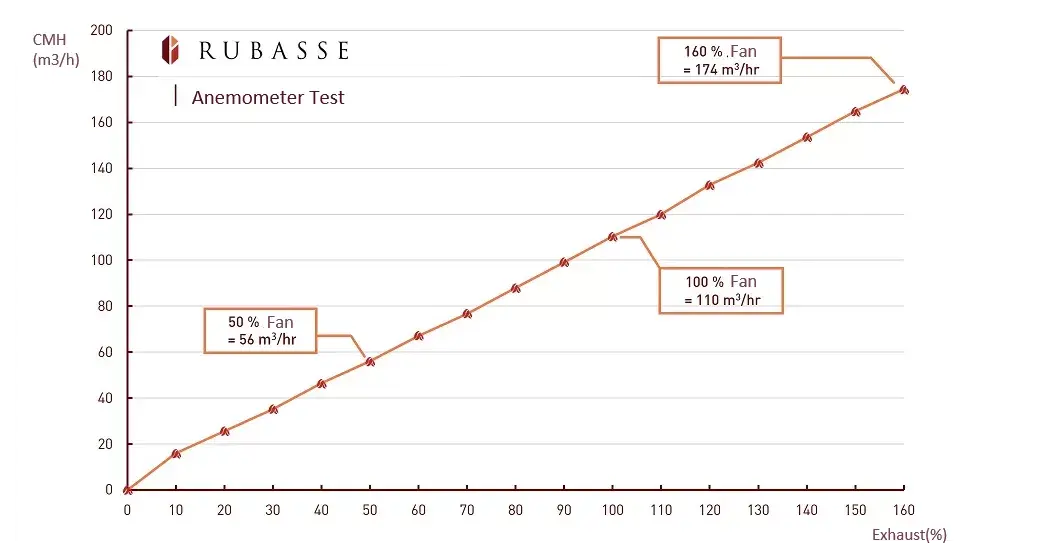 Taking Rubasse Infrared Digital Coffee Roaster as an example, when the exhaust is adjusted to 50% and 100%, the measured differential pressure is relatively around 10 Pa and 40 Pa. We can thus make predictions based on the exact correlation. While roasting, we are able to accurately estimate the instant volume of the airflow based on the differential pressure.